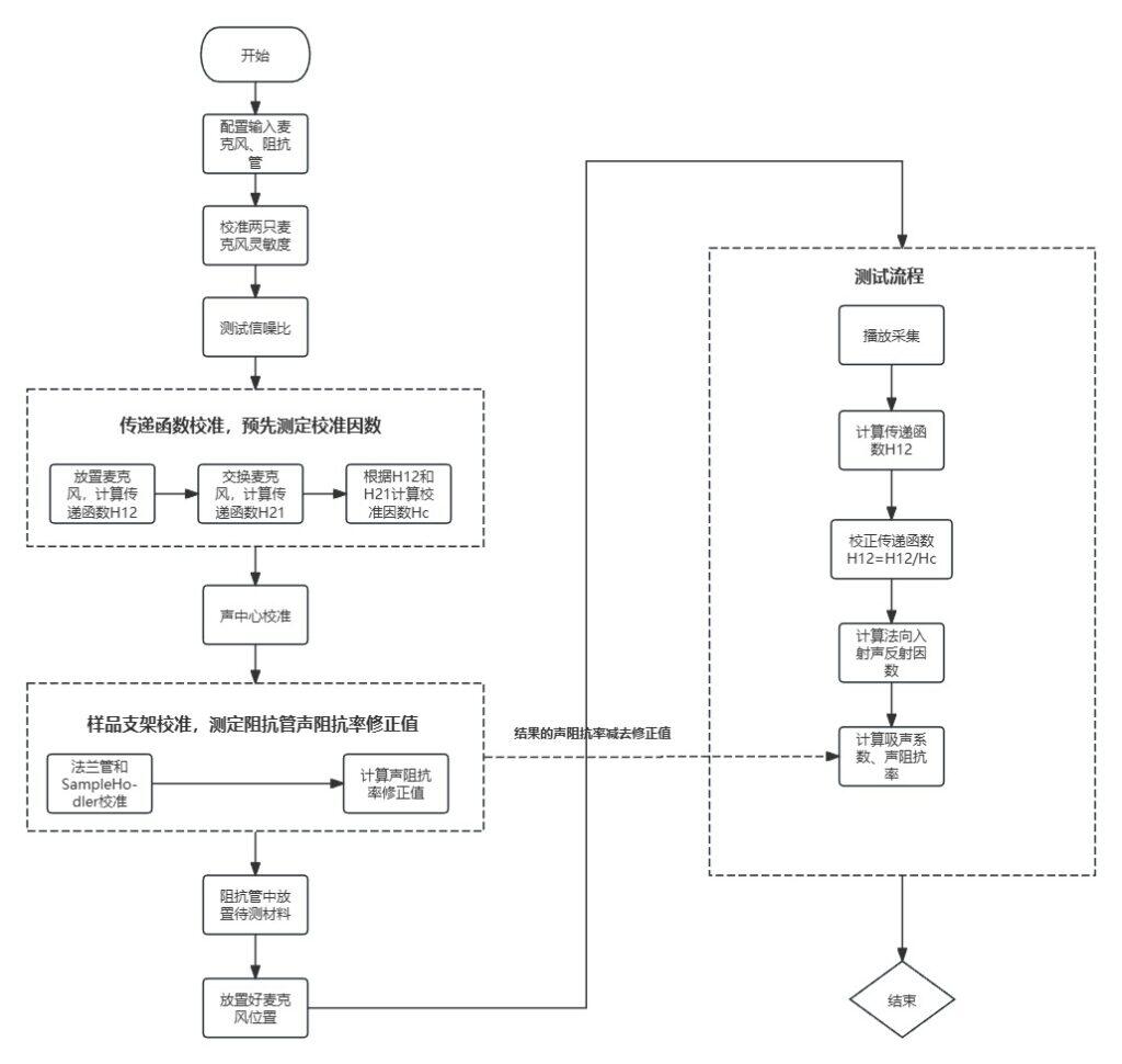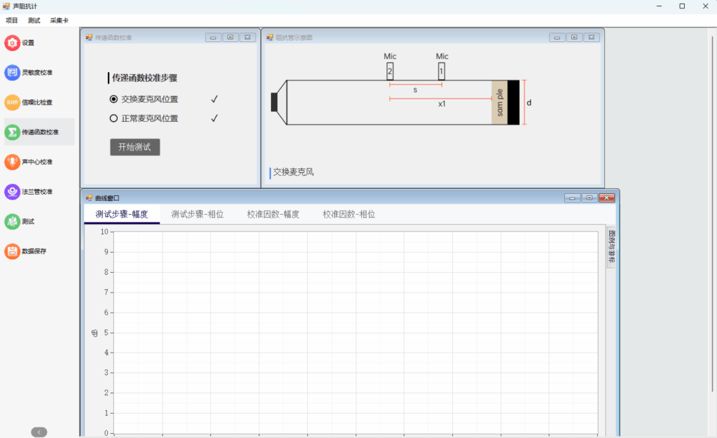 在软件系统方面,我们提供了一套从校准-测量-分析-报告的完整流程,尽量把声阻抗测试中繁琐又关键的步骤“做细做好,又让用户少操心”。在测试前,软件首先引导完成输入输出校准,确保声源输出与采集通道的增益、相位都处于受控状态;随后进行信噪比检查,自动评估当前测试环境与硬件配置是否满足有效测量条件,避免在低信噪比下浪费时间。针对传递函数法的特点,软件集成了传递函数校准与双传声器声中心距离校准模块:通过专门的校准工步,自动修正通道间幅相误差以及麦克风声中心位置偏差,从源头降低高频波动和计算误差。同时,还支持法兰管校准,对法兰连接处的泄漏与几何误差进行补偿,使阻抗管在接近实际使用工况的前提下,依然能得到可靠的吸收系数与声阻抗结果。整个流程均符合