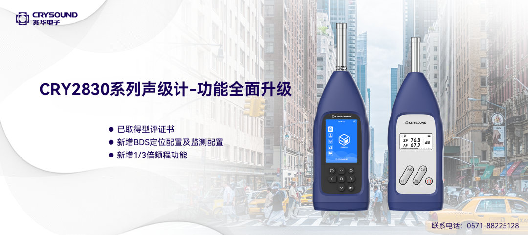 软件配置项升级,新增1/3倍频程分析 倍频程分析更精细: CRY2830系列现支持选配总值积分,统计积分,1/1倍频程及1/3倍频程功能,分析更精细,诊断更专业。 硬件配置项升级,新增BDS定位 无线传输&位置可追溯: 蓝牙WiFi版本:支持无线传输秒级测量数据,适合无线监测; BDS版本:提供精准地理定位,方便交通噪声、施工噪声和城市环境监测数据可追溯。 功能与存储升级,新增大容量存储功能 标配 4GB 内置存储 + 32GB microSD 卡: 长时间监测数据不丢失,适合长期项目和科研应用。 新增户外监测套装支持 可搭配 延长线 + NA41 套装: 实现全天候噪声监测集成,适合城市道路、施工现场或工业园区使用。 CRY2830 · 典型应用 系统集成噪声监测: CRY2832系列声级计可作为被集成设备,支持多设备组网与云端管理,通过WiFi/RS232接口实现噪声 监测系统无缝集成。 建筑施工噪声监测: 针对打桩、破碎等高噪声工序,CRY2832-H高声压款抗过载能力强,可通过统计功能记录Lmax峰值噪声, 配合录音模块留存证据链,确保施工方合规管理。 产品噪声测量: CRY2832系列声级计支持1/1倍频程、1/3倍频程及SEL声暴露级计算,彩屏动态显示LN数值,助力企业优化产品声学质量。 城市交通噪声监测: CRY2832系列声级计可选配北斗/GPS双模定位模块,部署后实时记录噪声数据并自动标记超标位置坐标, 实现污染源精准溯源管理。 CRY2830CRY2830 · 应用案例 选用CRY2832系列声级计进行噪声集成监测,可将 LAF、Leq、LN等噪声测量数据直观呈现在大屏上。 CRY2832配合NA41保护装置(IP65防护)实现持续工作,超标自动触发录音并实时回传数据,完整记录噪声事件证据链。